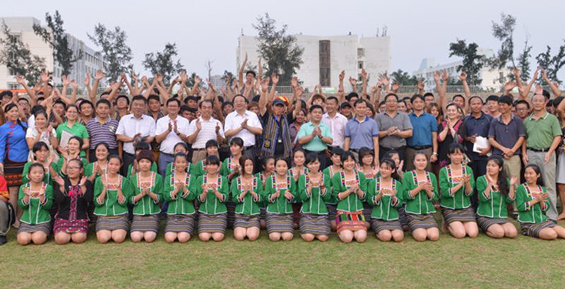 展示活动现场,2014级12 各体育班,367名员工身着黎族传统服饰,在黎族音乐伴奏下,有序展示12项黎族优秀文化元素。黎族旗帜、大鼓、铜锣、篝火、织锦、舂米、狩猎、钻木取火、祭火等表演仿佛将人们带入真实的黎族村寨,而黎族歌手用黎语演唱《大家都好吗》《织锦赞美歌》《赶鸟歌》等歌曲,烘托出浓郁的黎族风情。