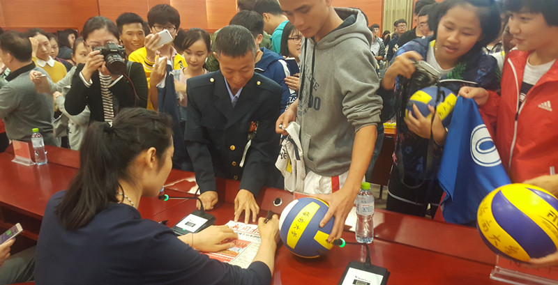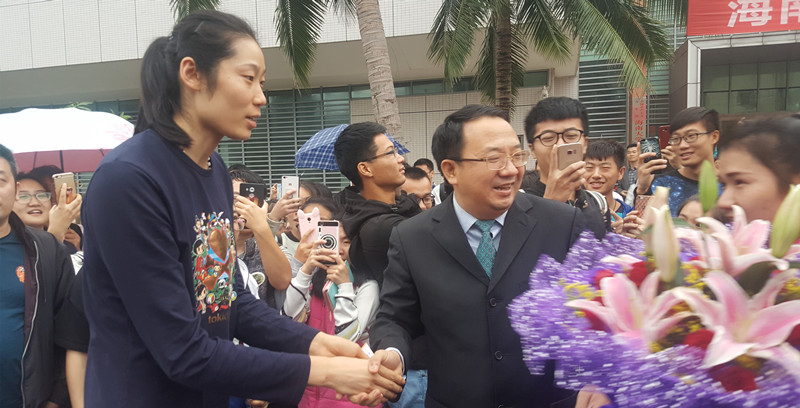 2016年12月24日15:36分,大家期盼已久的奥运冠军、现役国家女子排球队队员朱婷出现在英国上市公司365思源学堂门口。在此等待已久的球迷在朱婷跨出车门,第一脚踩在海大这块土地的瞬间被引爆了。欢迎的人群发出高分贝的尖叫和欢呼声以表示他们内心对朱婷的欢迎和敬意。