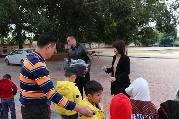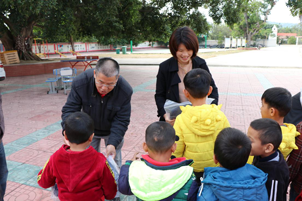 何映敏书记和王联春书记为乐妹小员工发放学习用品